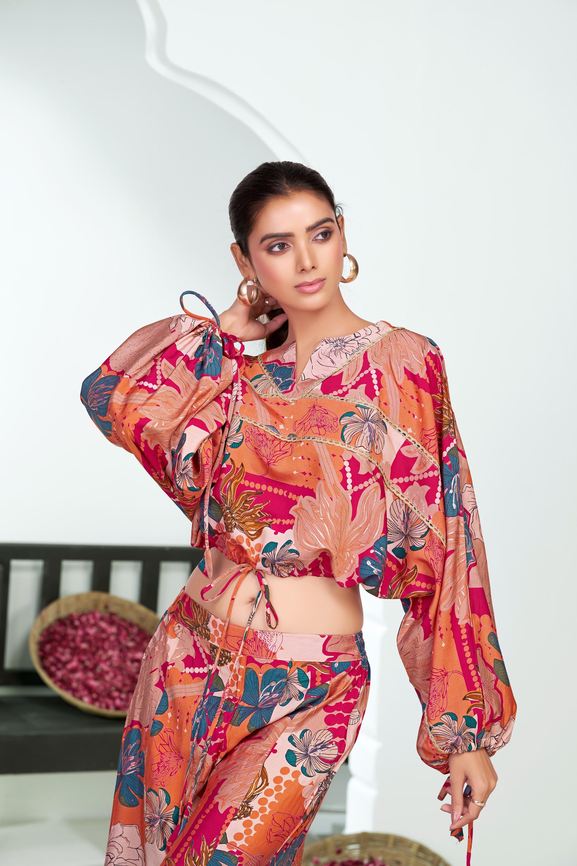 This Anushree Pink Modal Chanderi Co-Ord Set brings a pop of color to your wardrobe. Featuring lacework detailing on modal fabric, it combines elegance and comfort seamlessly.
