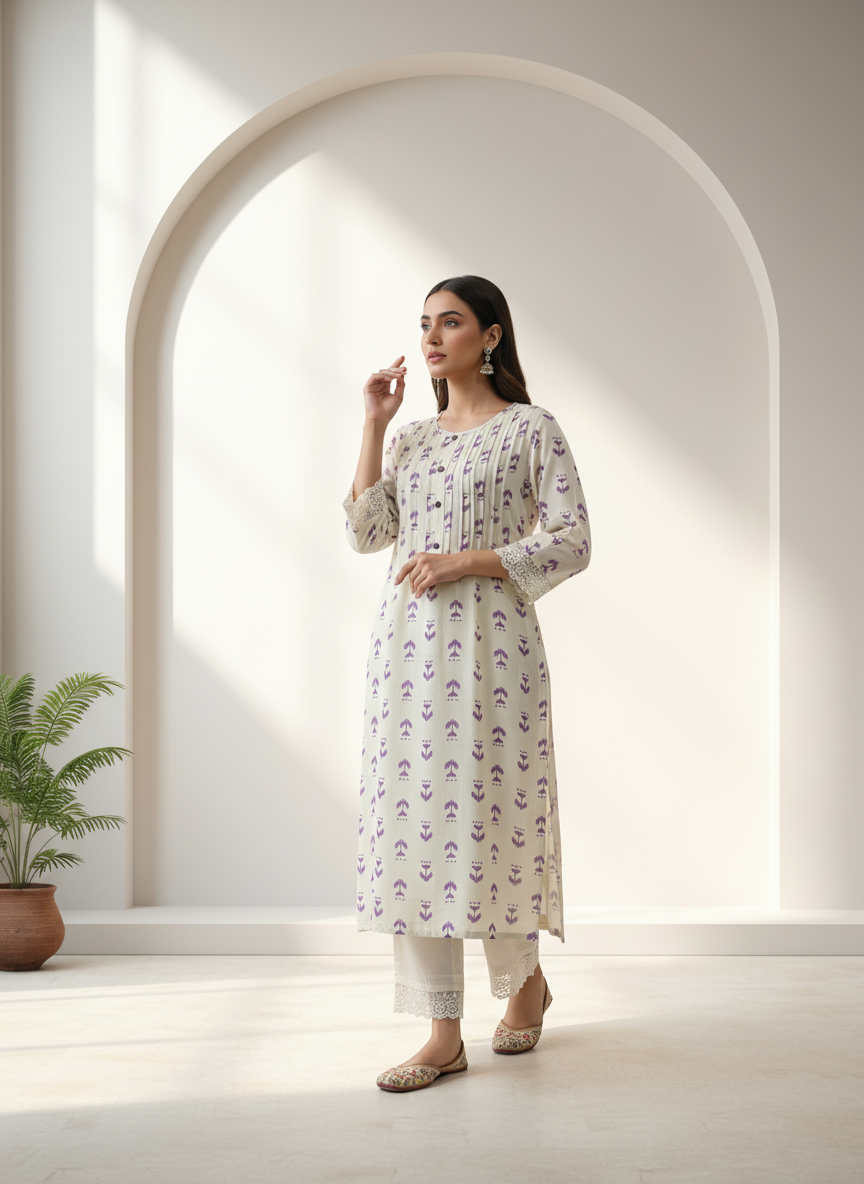 Crafted from premium-quality rayon, the fabric offers a soft, breathable feel that drapes beautifully. The kurta’s clean, straight-cut design pairs seamlessly with the matching pants, creating a balanced, contemporary ethnic look.