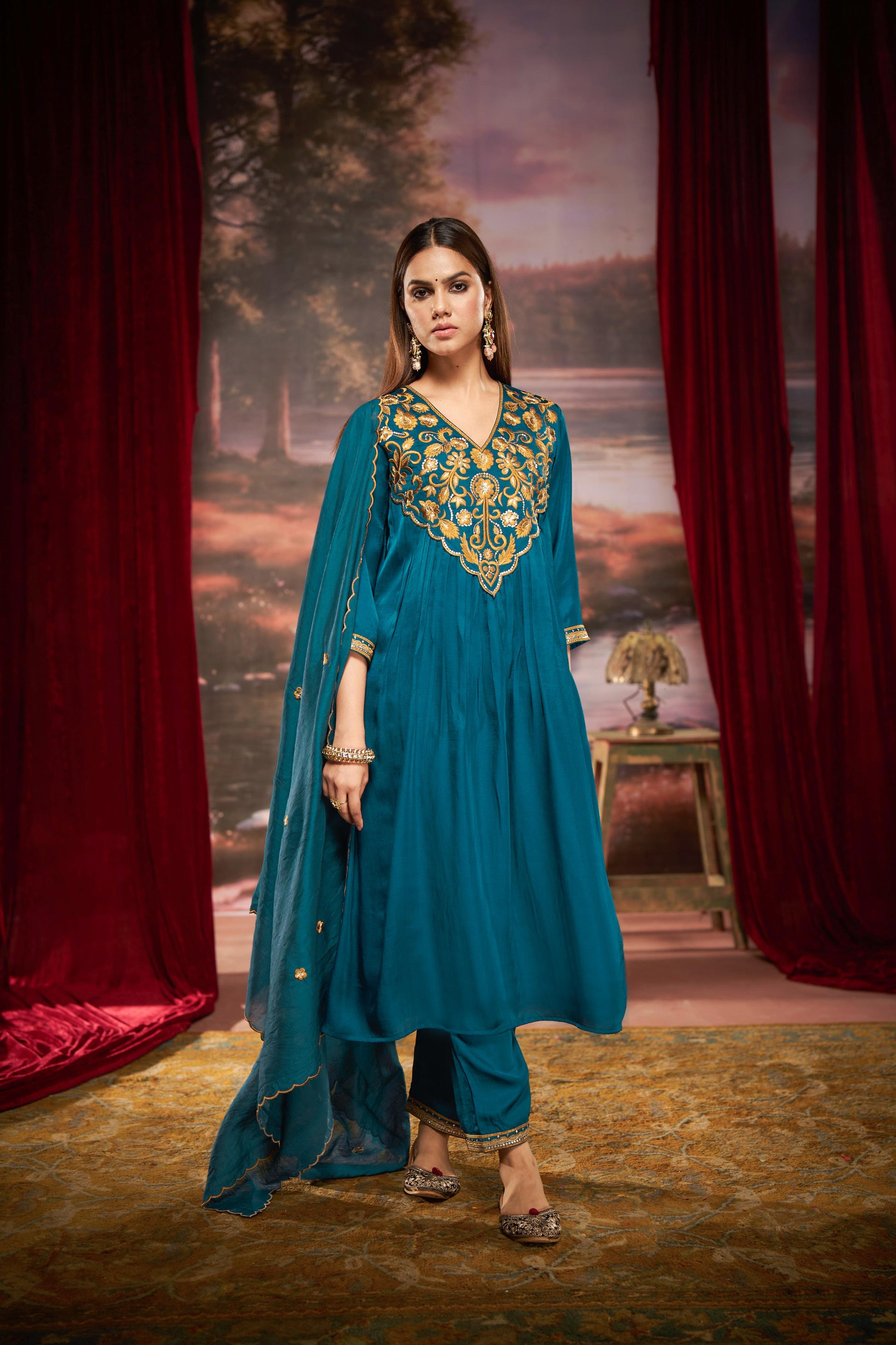 Raajvee Peacock Blue Pure Silk Suit Set with Dupatta and Cotton Mul Lining Featuring Handcrafted Resham and Zari Embroidery with Sequin Embellished Designer Neckline