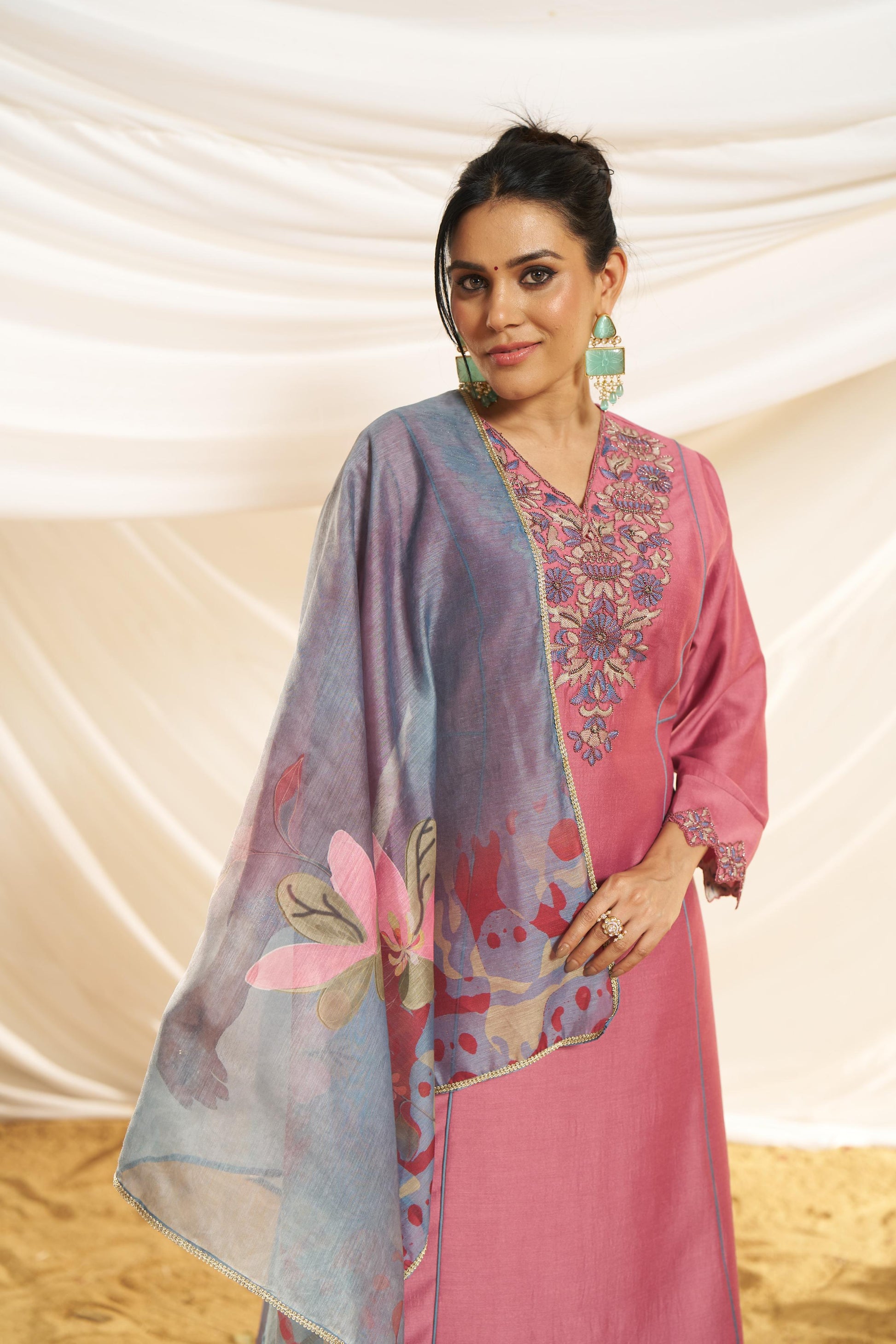 BulBul Women Dusty Pink Embroidered Premium Silk Straight-Shoulder Cut Suit with Dupatta