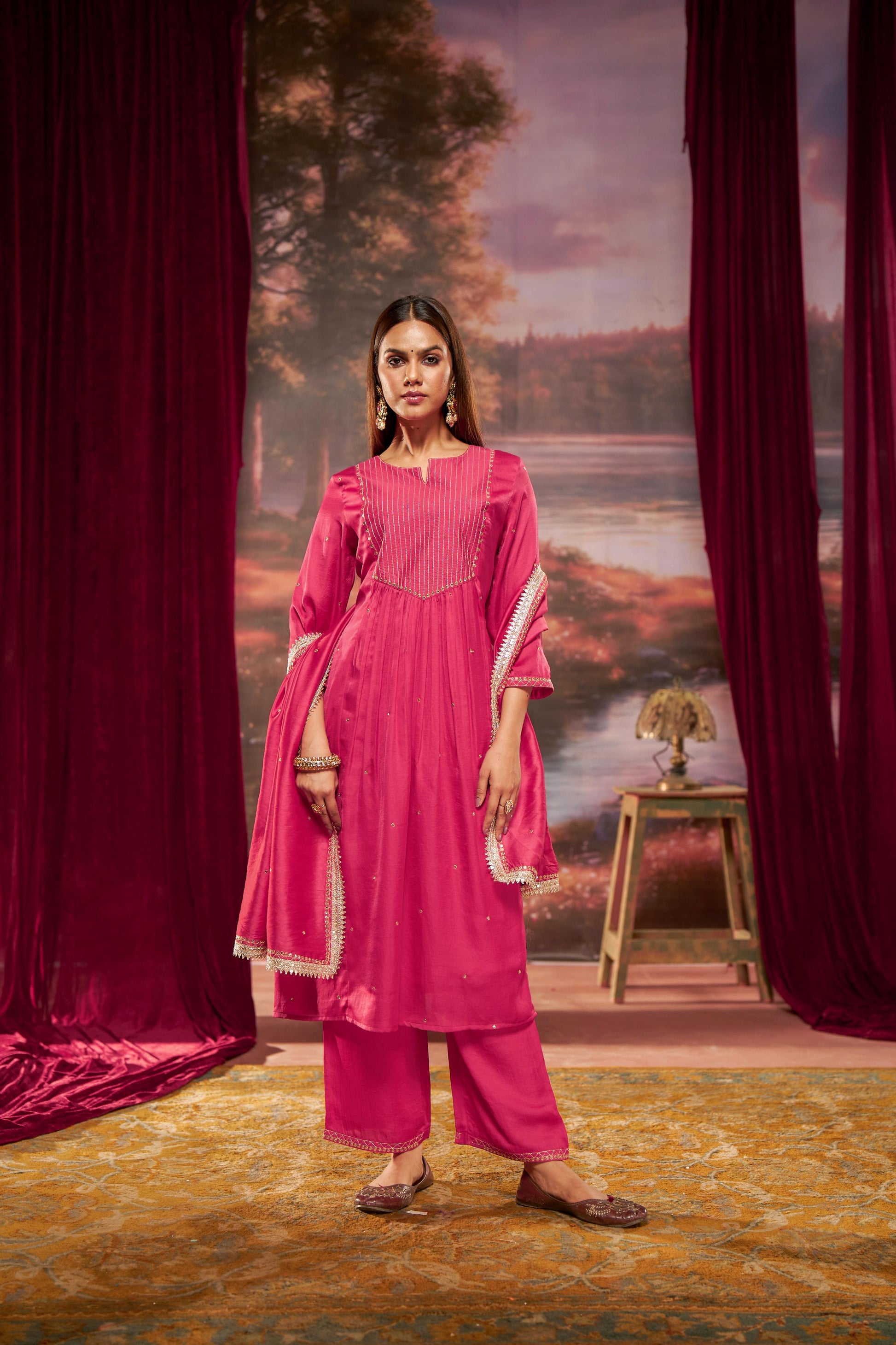 Vibrant yet elegant, this premium fuchsia silk kurta set is designed to make a refined festive statement. Crafted from rich silk fabric, the kurta features intricate embroidery on the front panel, adding depth and artisanal detailing to the design. The A-line silhouette offers a flattering, flowy fall, while the construction is finished without side slits for a clean and graceful look.