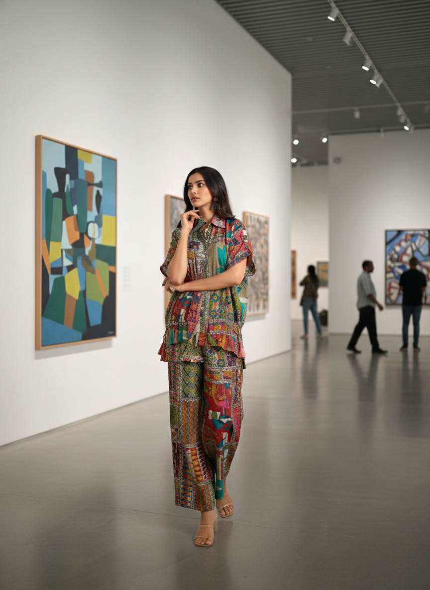 Kate Beige Modal Chanderi Patchwork Print Co-Ord Set with Sequin and Glass Bugle Bead Embellished Collar