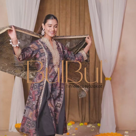Includes matching chiffon dupatta with printed motifs and lace-bordered edges