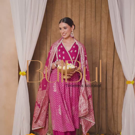 Handcrafted sequin and bead work on neck and sleeves Lurex printed dupatta adds shimmer and festive elegance