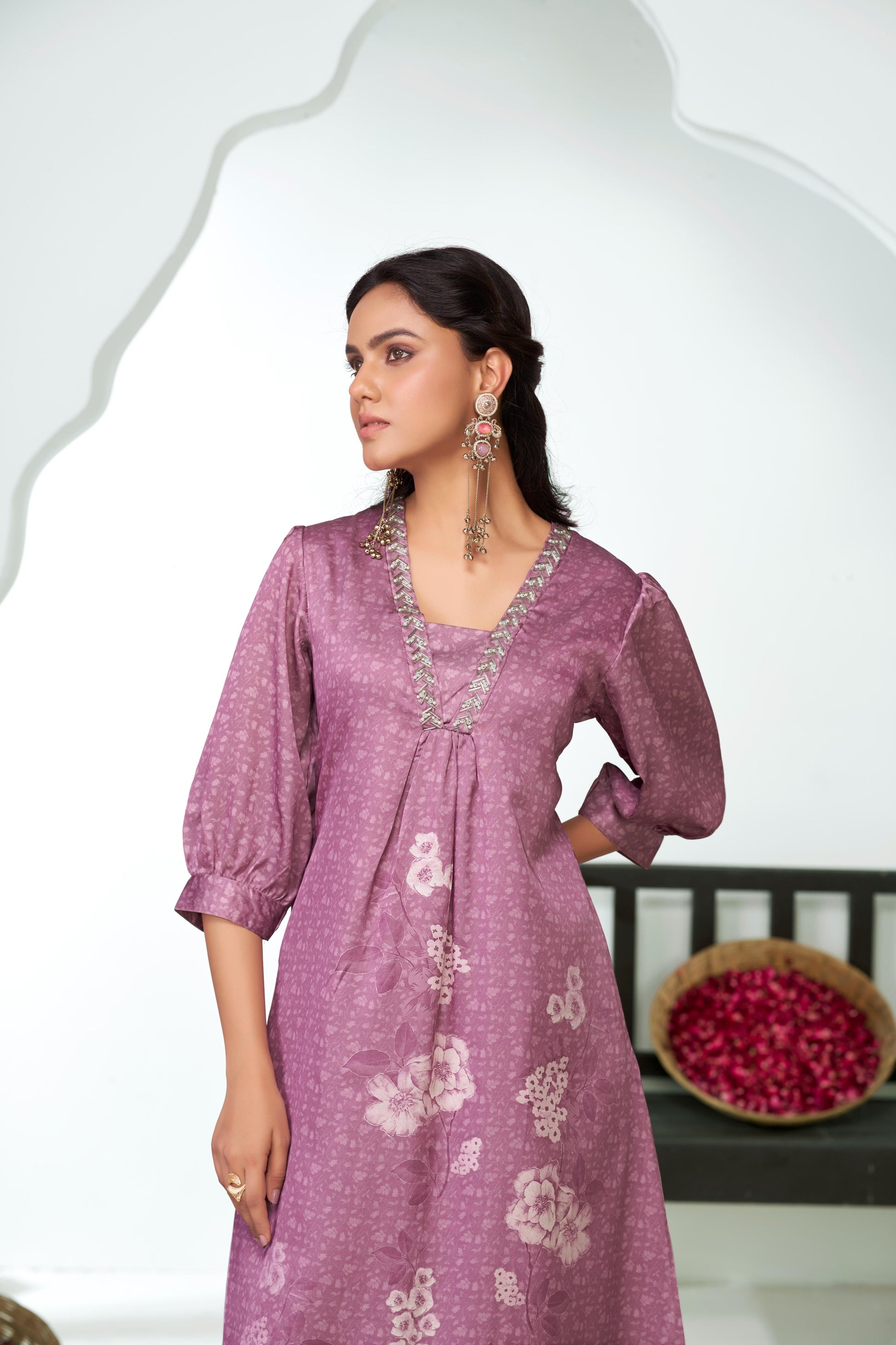 Kurta: A soft lavender vanilla satin silk kurta, beautifully embroidered with a digital print.