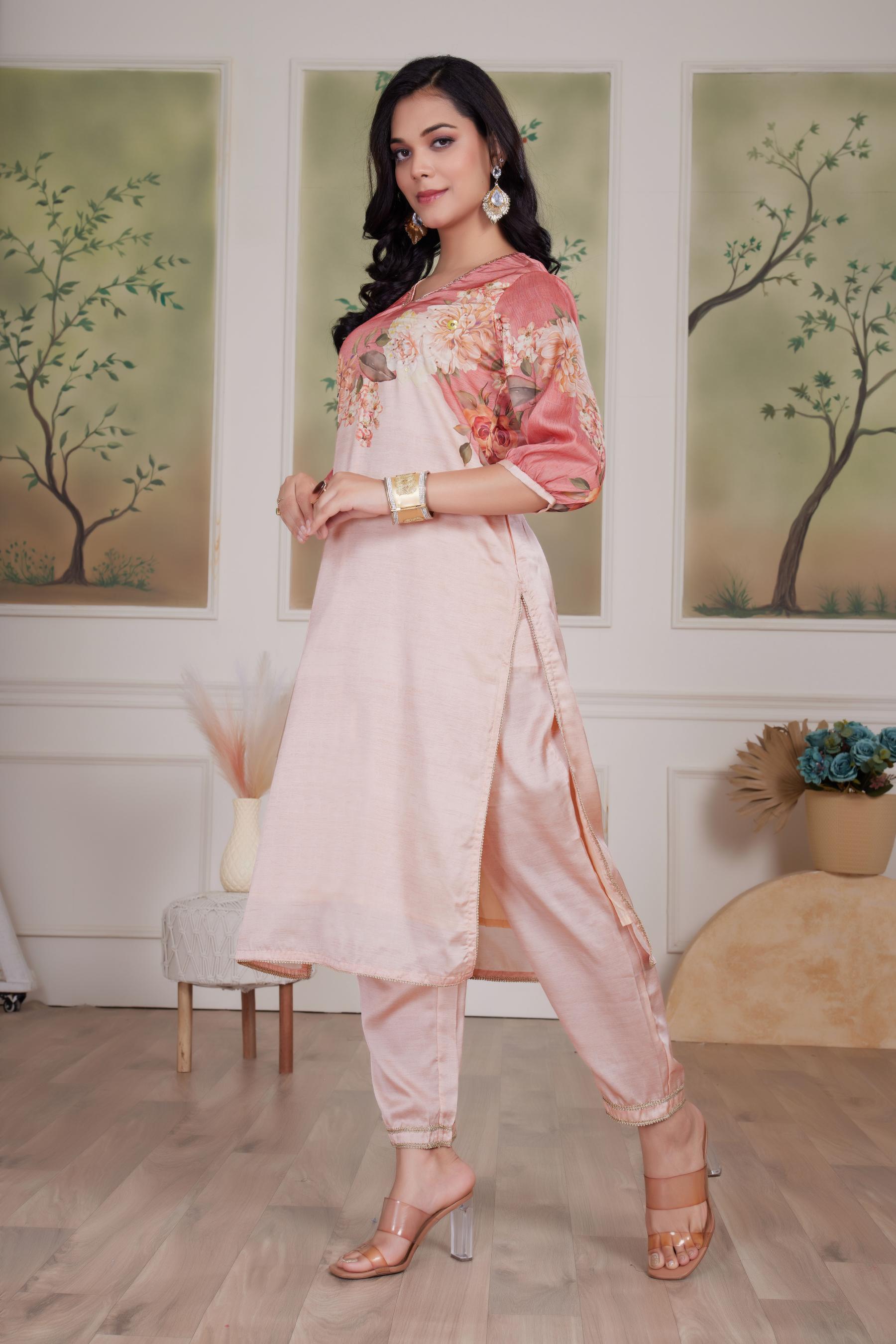 Lightweight chiffon dupatta complements the kurta with printed motifs and lace border