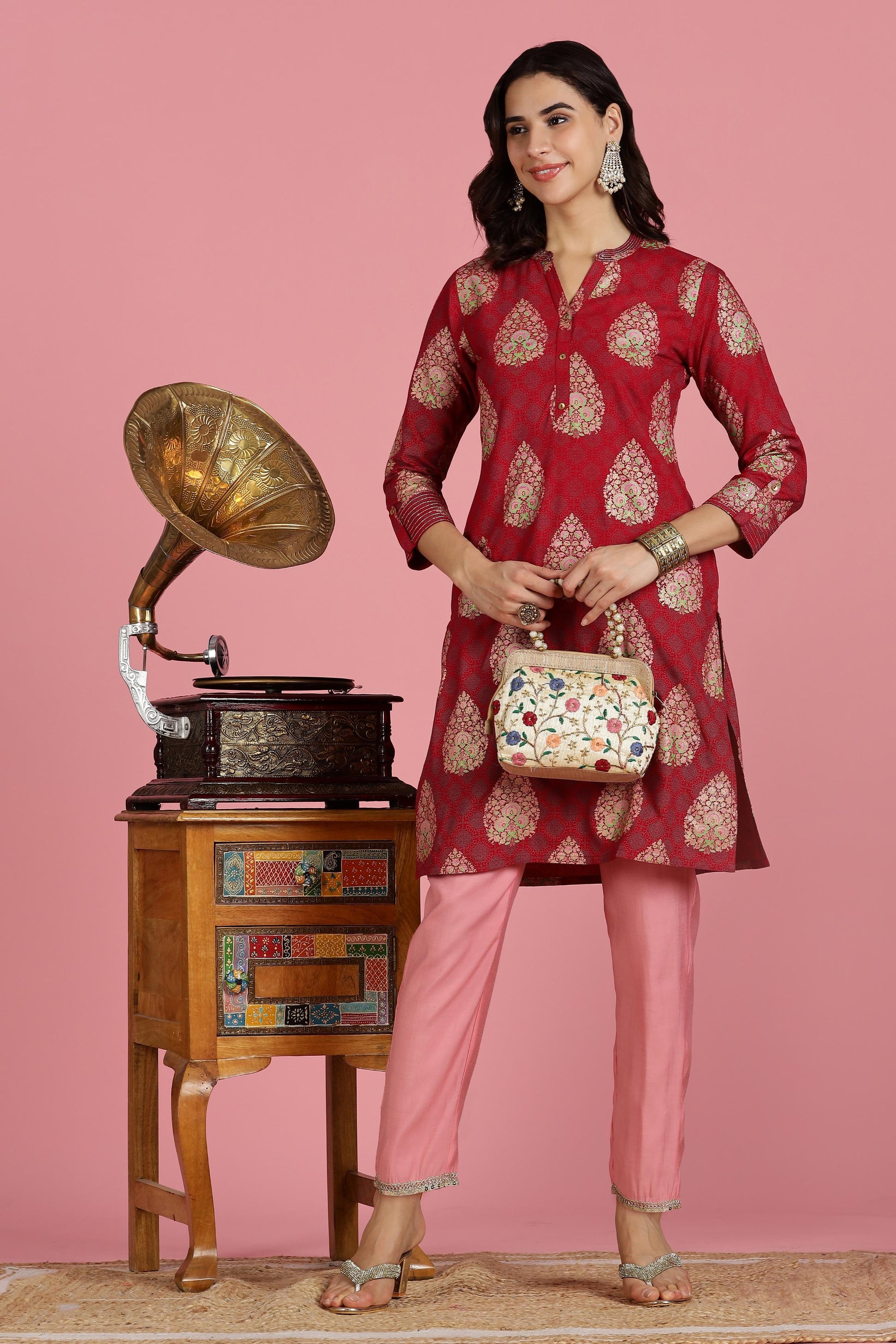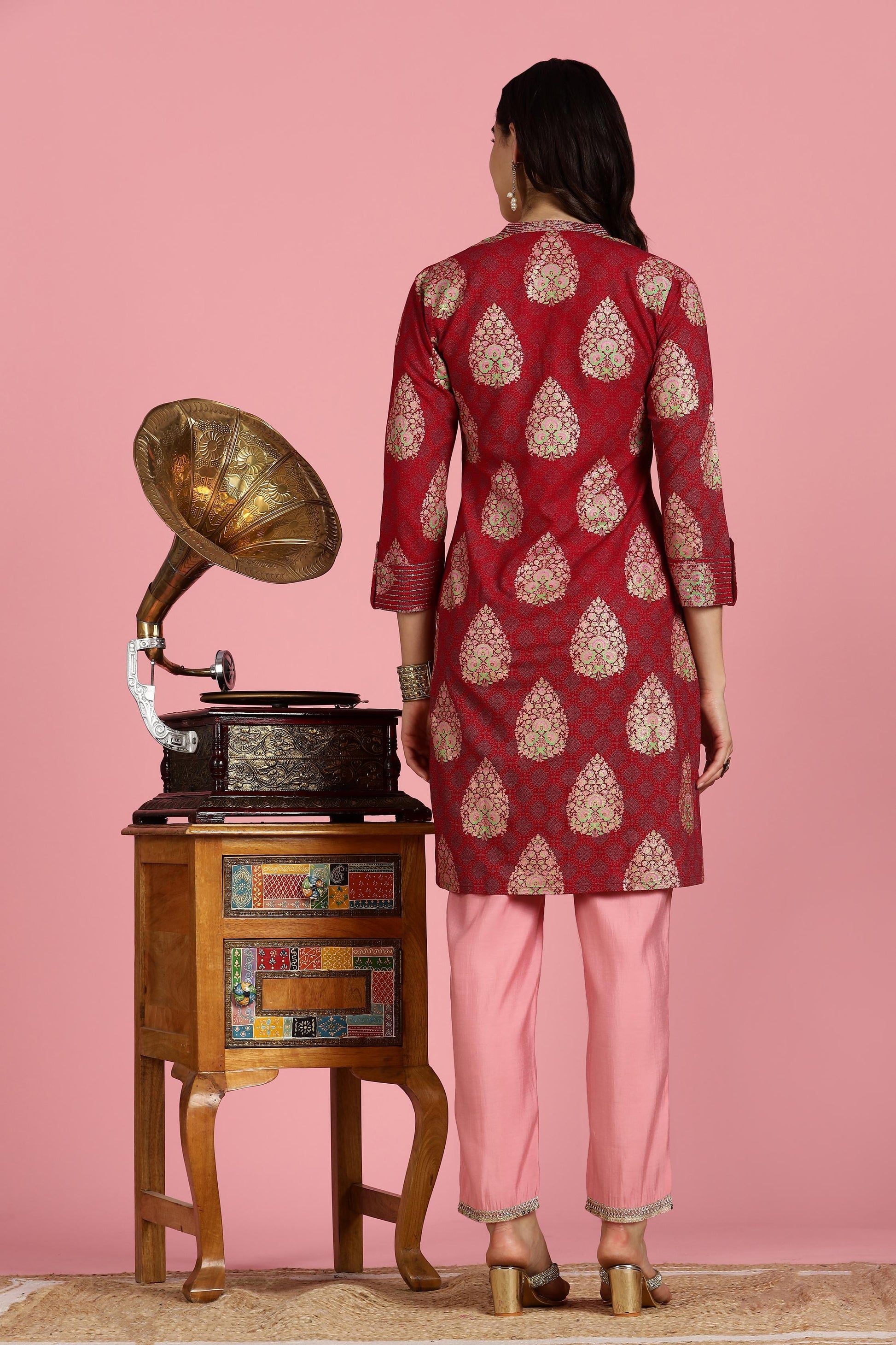 Add a royal touch to your ethnic collection with this Maroon Embroidered Rayon Kurti. Designed in rich maroon fabric, this kurti features intricate golden and floral motifs that enhance its festive elegance. The straight-fit silhouette with a buttoned neckline and 3/4th sleeves makes it both comfortable and stylish for every occasion.